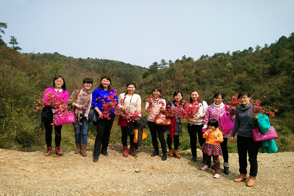 一眼望不到头的油菜花在阳光的照耀下闪着金色的光芒;一阵风吹过,花的清香和着青草的香味沁入心脾;菜花摇曳着,和花间爱美的人儿在相机的“咔嚓”声中展现着多姿的身段;爱凑热闹的蜜蜂和蝴蝶也翩翩起舞;女教师们一块赏花、聊天,孩子们在一旁追打嬉闹,热情参与的男老师们主动担当起了摄影师的职责。远远的,有游人手捧着映山红走来,激起了大家的好奇心,于是爬山、摘映山红便成了踏春的第二项活动,大家相互比较着采摘的花,“你的还是花苞呢,回去还美得上一段呢”,“看看你那把,真好,开得正艳”……当然,耗尽体力的老师们没有放过正宗的农家菜,大快朵颐了一把。