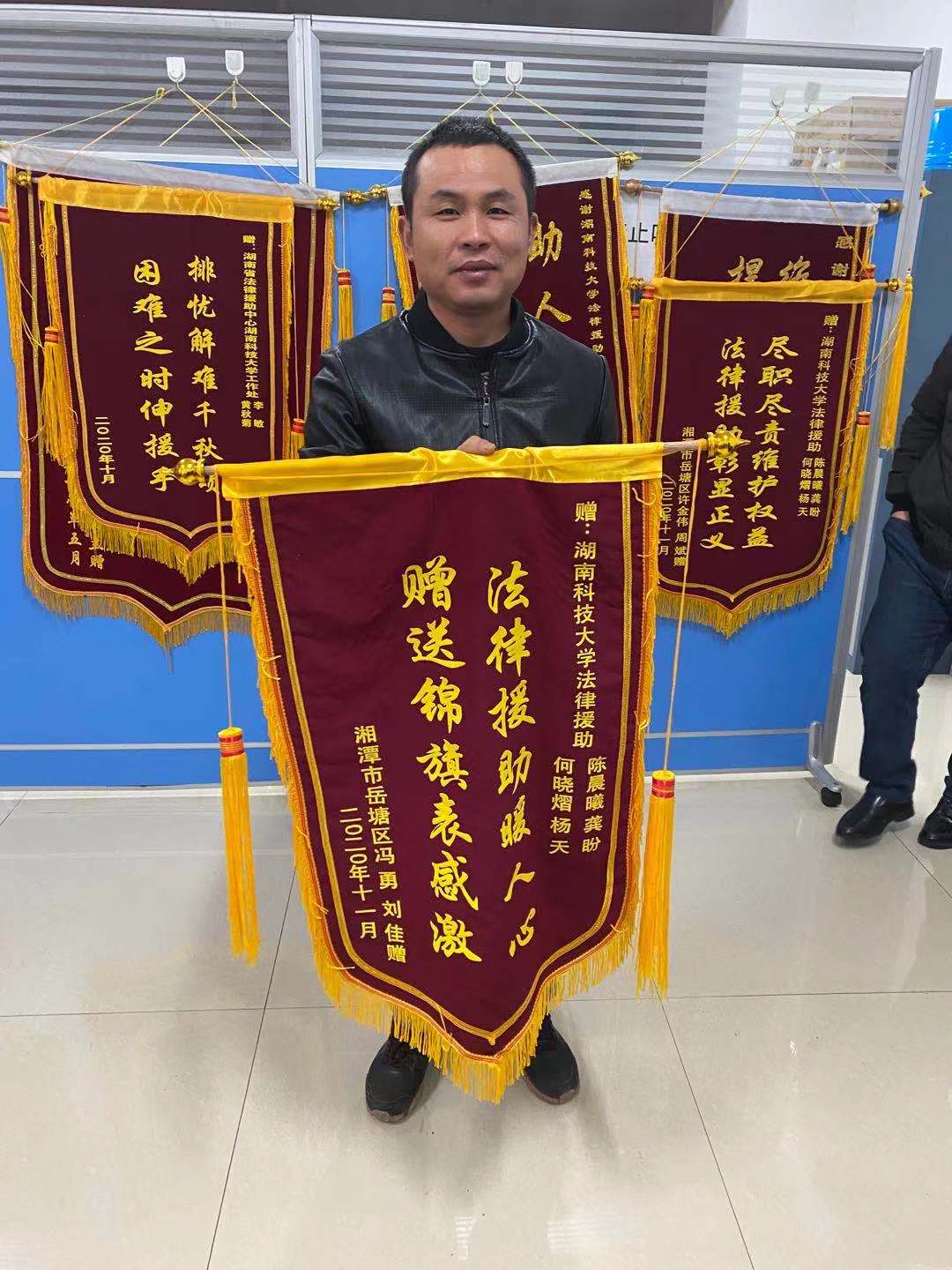 “真心感谢你们,这段时间辛苦你们了!”这是11月30日,周斌等四位受援人将两面分别写有“尽职尽责维护权益,法律援助彰显正义”“法律援助暖人心,赠送锦旗表感谢”的锦旗送到湖南科技大学法律援助中心志愿者手中后说的一席话。