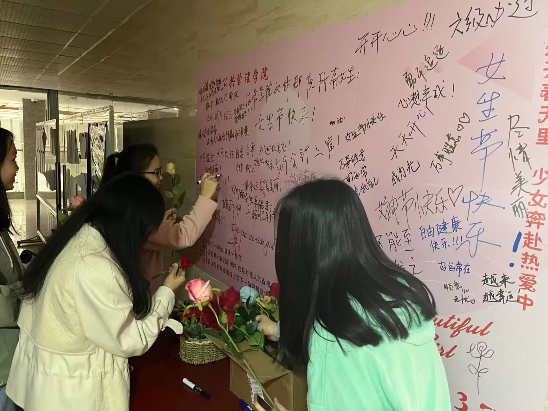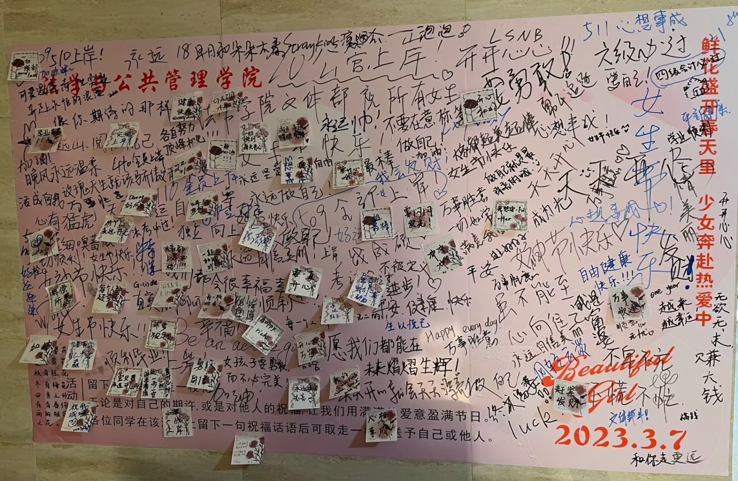 3月7日,文体部成员于立言楼二楼设置“春日鲜花礼”祝福墙,吸引众多同学前来参加活动,大家在留言板写下对自己的期许以及对各位女生真诚的祝福。留言板中“上岸”、“做自己”、“不被定义”的字样彰显着女孩子们积极向上的朝气与力量。此活动向大家传递春日温暖,也充分体现了我院对女性的尊重与爱护。