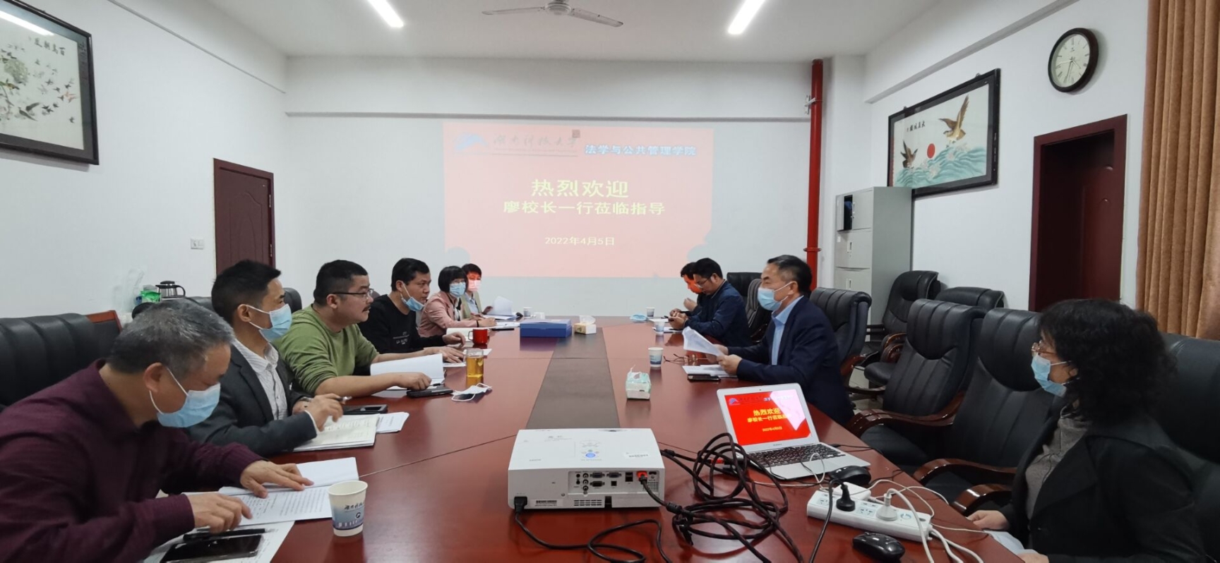 4月5日-6日,副校长廖湘岳、国有资产与实验室管理处廖文军科长和胡大辉科长、教务处质量监控与评估办公室尹利平主任一行莅临我院,就公共资源使用及防疫防控工作进行现场检查,院党委书记邱帅萍、副书记叶军、教学副院长王明、实践中心主任左洪剑、法学系主任吴四江、实验室与国有资产管理员周安春老师与会。