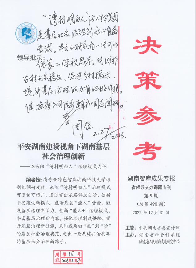 为深入了解湖南基层社会治理积累的经验和存在的问题,课题组先后赴耒阳、新化、洞口、沅陵等地开展实证调研,并邀请省内外智库专家进行反复论证,形成题为《平安湖南建设视角下湖南基层社会治理创新---以耒阳“弯村明白人”治理模式为例》的研究报告。该报告于2022年12月31日在湖南智库成果专报《决策参考》上刊发。2023年2月27日,湖南省人大常委会副主任周农批示,充分肯定了研究报告有“深度思考”,“对维护农村社会稳定、促进乡村振兴、提升基层治理能力有积极作用”。