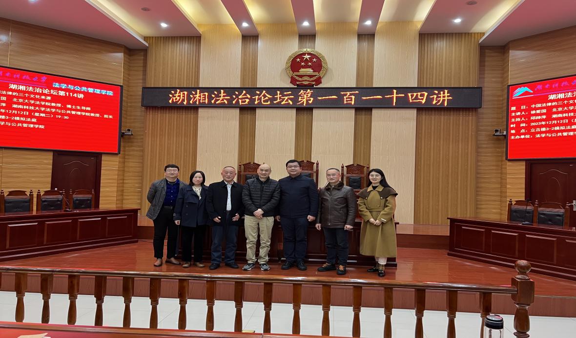 2023年12月12日湖湘法治论坛第114讲在立言楼A3-2模拟法庭举行,讲座邀请了北京大学法学院的徐爱国教授作为嘉宾,由湖南科技大学yl6809永利的邱帅萍院长作为主持人,湖南科技大学yl6809永利的胡正昌教授作为与谈人参与讲座,湖南科技大学yl6809永利党委书记郑海祥、徐德刚教授、李倩老师等学院领导老师及学生也参与了此次讲座。