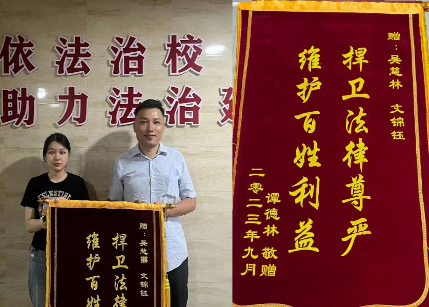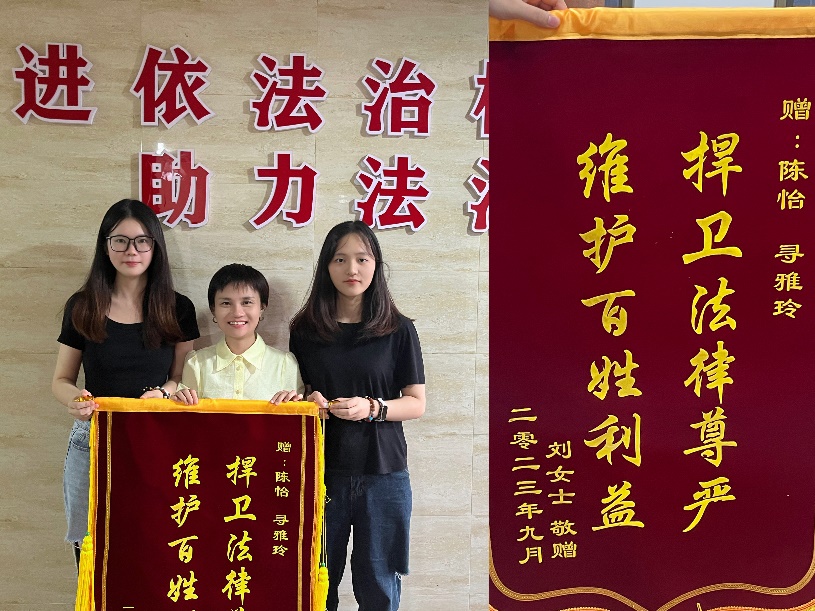 2023年6月20日,我校法律援助中心志愿者陈怡、寻雅玲、吴慧琳、文锦钰成功帮助当事人刘女士、谭先生解决劳动纠纷问题。9月5日,二位当事人特意前来我校给志愿者们送上“捍卫法律尊严,维护百姓利益”的锦旗,表达感激之情!