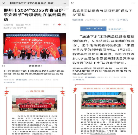 【 图为红网、团县委、县司法局对“ 送法下乡 ”“ 春风行动 ”“ 暖冬行动 ” 等活动报道节选 】