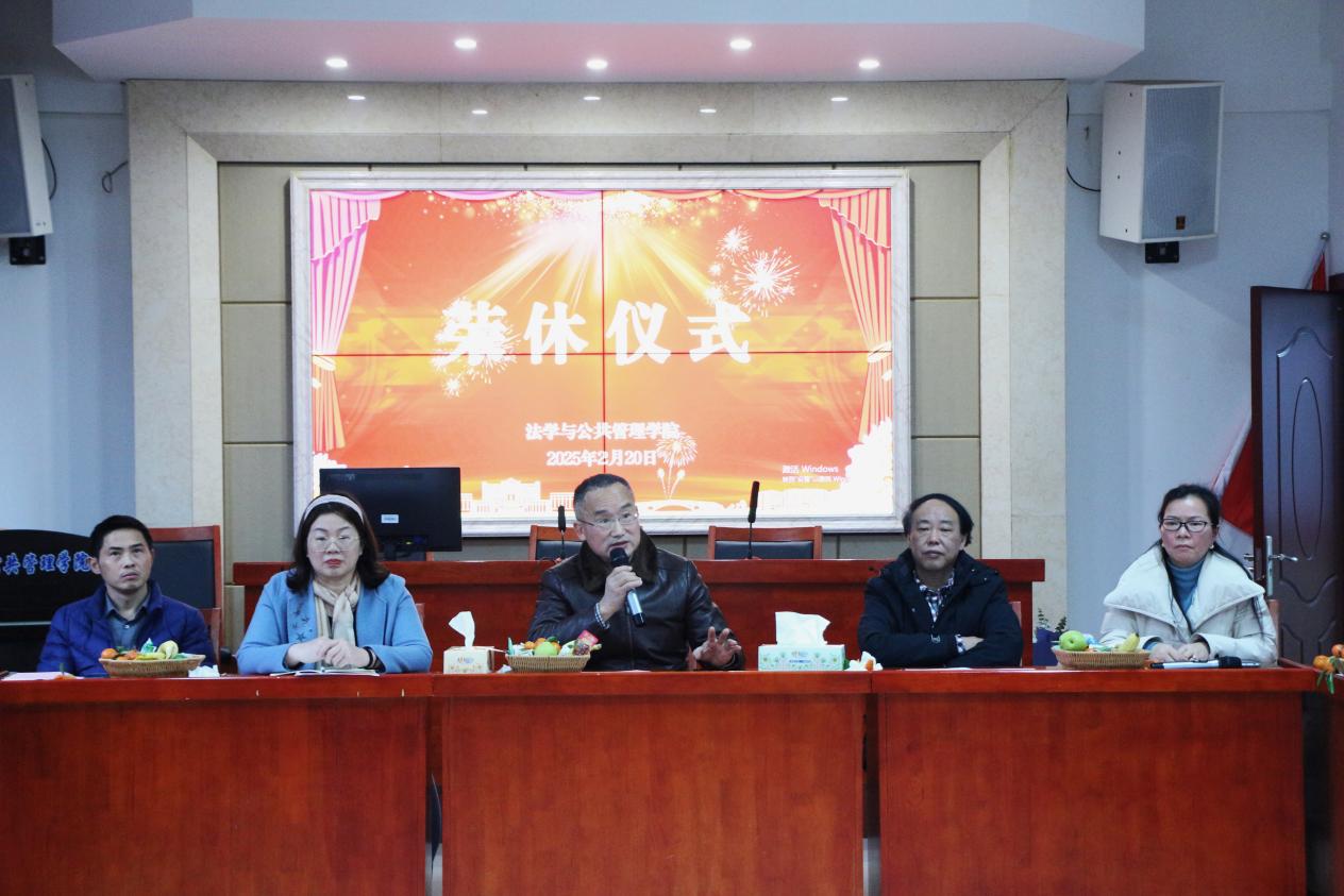 “岁月映初心,薪火永相传”,2月20日下午,湖南科技大学yl6809永利在立言楼A425隆重举行了徐德刚教授的荣休仪式。法管学院全体教师齐聚一堂,两位校友专程返母校出席,仪式由院党委书记郑海祥主持。