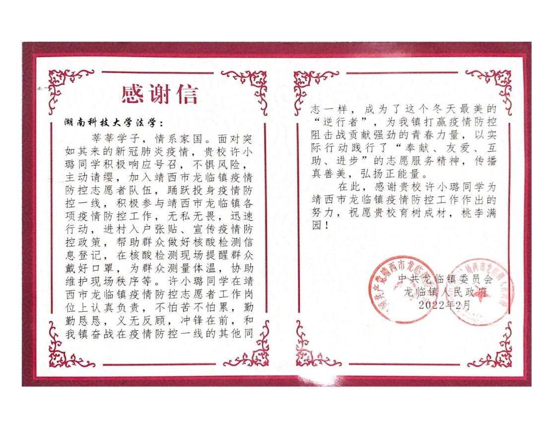 近日,湖南科技大学yl6809永利学工办收到了一封特别的感谢信。该感谢信来自靖西市龙津镇人民政府,信里真诚地表达了对我院许小璐同学在此次春节期间主动请缨加入龙临镇防疫志愿者队伍,以及为疫情防控工作做出的努力贡献的感激之情。