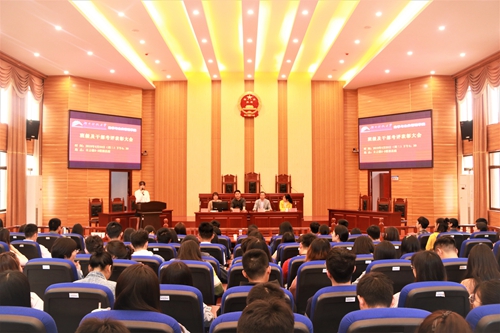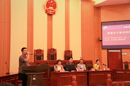 2019年4月23日下午四点三十分,湖南科技大学法管学院班级及干部考评表彰大会在立言楼模拟法庭召开。yl6809永利党委书记黄伟老师、党委副书记蒋会平老师、团委书记朱荣老师、辅导员沈琪老师以及团委学生会干部、各班班长、团支书和班集体代表出席了此次大会。