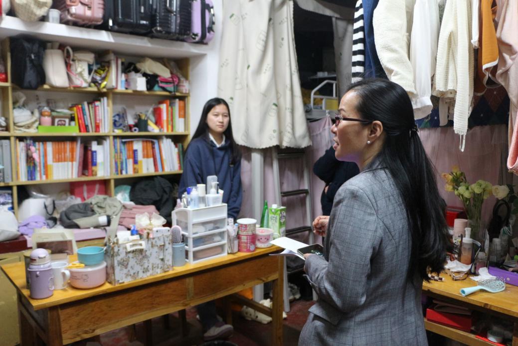 在查寝过程中,有许多寝室只有一到两人“留守”,具体了解后才得知,诸多同学此时正在图书馆学习。范书记对这一行为大加赞赏,同时,她鼓励同学们努力考研,结伴考研,相互鼓励,共同进步,希望各位同学能够为考研早做准备。彭老师也耐心地询问同学们的学习生活状况,认真倾听同学们的心声,以尽最大努力为同学们提供帮助。最后范书记也强调,“大学这么多人,来自五湖四海,能够成为室友也是一种缘分。大学四年,无论是生活上,学习上,感情上,心理上,彼此之间都应该互帮互助”。同学们面对老师们亲切的面庞,倾听着关心的话语,纷纷点头,望向身旁的室友,无不倍感温暖。