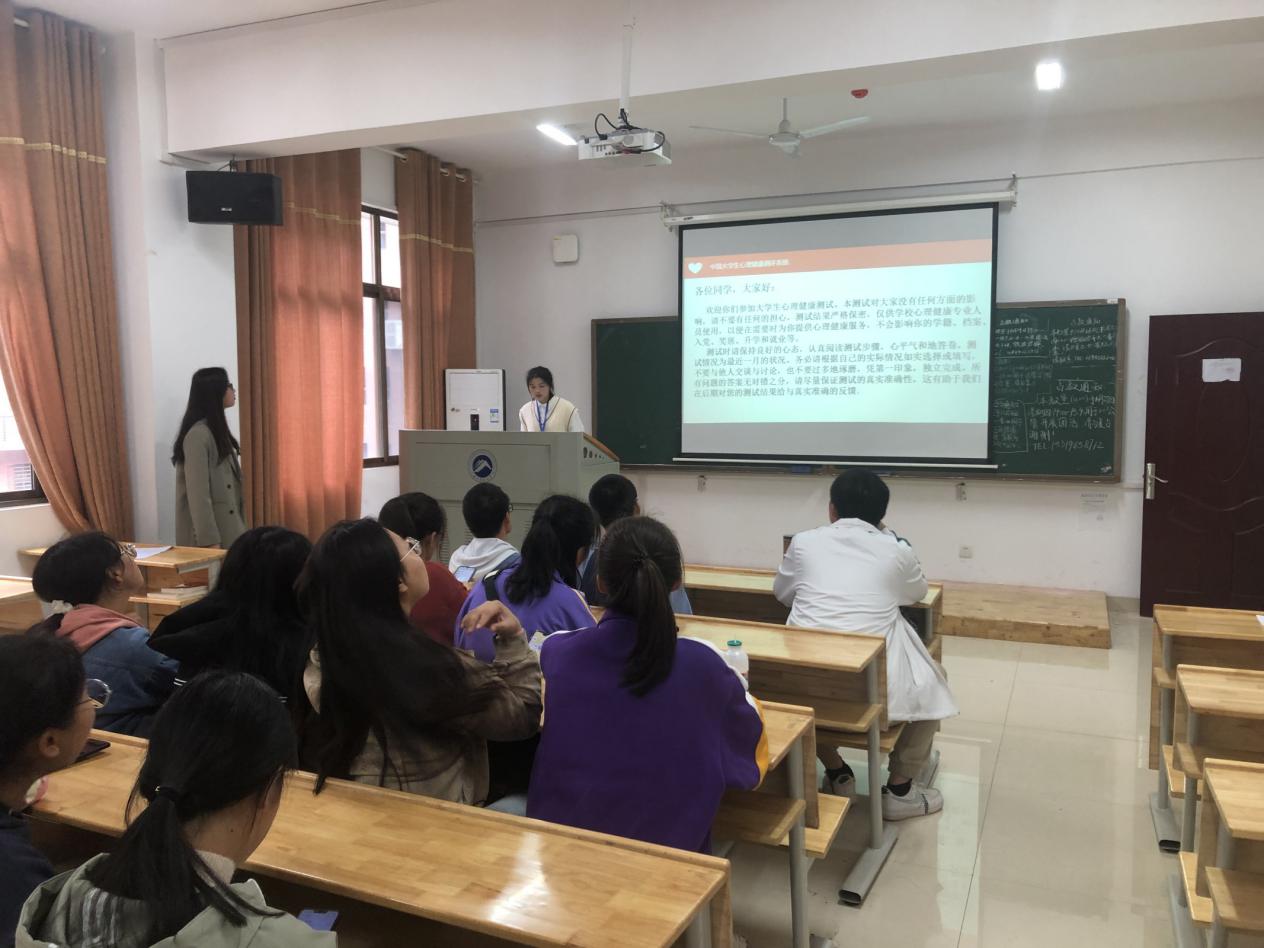 然后,心健部委员向同学们介绍了本次心理健康普查的重要性以及注意事项,并指导同学们进入测评平台,帮助解决同学们遇到的各类问题。
