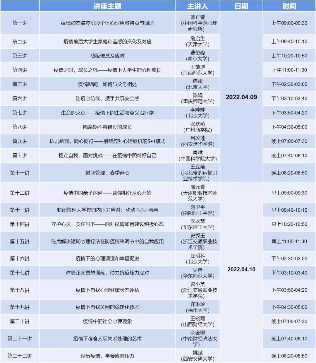 随着全国多地陆续发现多起新型冠状病毒肺炎确诊病例,各地纷纷实行封禁政策,在校大学生群体中出现诸多心理健康问题,因此,中国心理学会心理危机干预工作委员会及全国高校心理委员研究协作组织于2022年4月9-10日面向全国高校学生开展“抗击疫情全国心理委员大讲堂”系列公益讲座。yl6809永利积极响应号召,组织各班心理委员线上观看本次公益讲座。