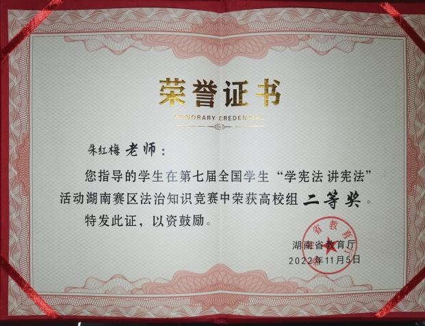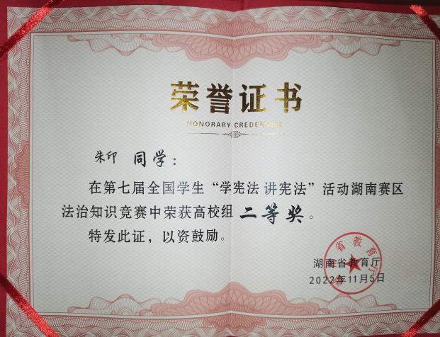 苦心人,天不负,朱印最后取得了第七届全国学生“学宪法 讲宪法”活动湖南赛区法治知识竞赛的二等奖。