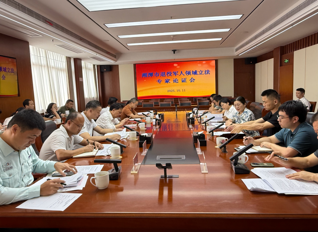 为深入贯习近平总书记关于退役军人的重要论述,全面推进退役军人服务与保障落实落地。2025年10月11日下午,湘潭市退役军人领域立法专家论证会在湘潭市人大常委会召开,我院副院长宋智敏教授、朱正余副教授、法律硕士生向诚组成的立法团队出席了本次会议。