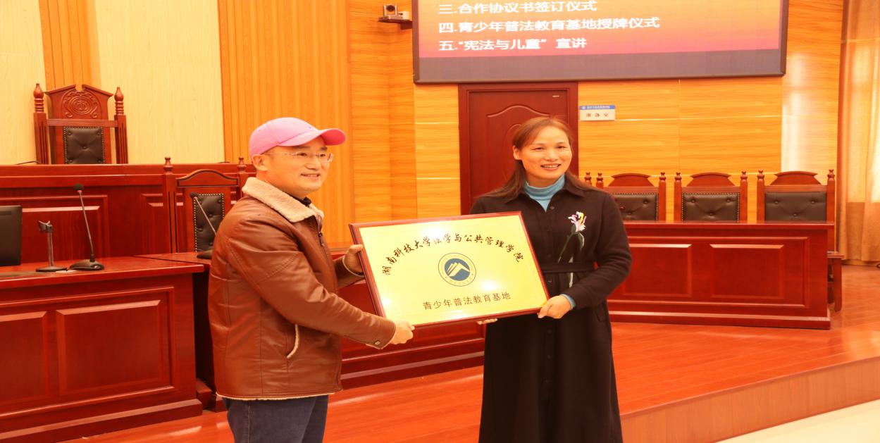 活动开始前,yl6809永利院长徐德刚教授和逸夫小学校长李芳老师分别致辞,并在现场订立了 《湖南科技大学yl6809永利青少年普法教育基地合作协议书》,达成了长期合作意向。徐院长为设立在逸夫小学的普法教育基地进行了正式授牌。