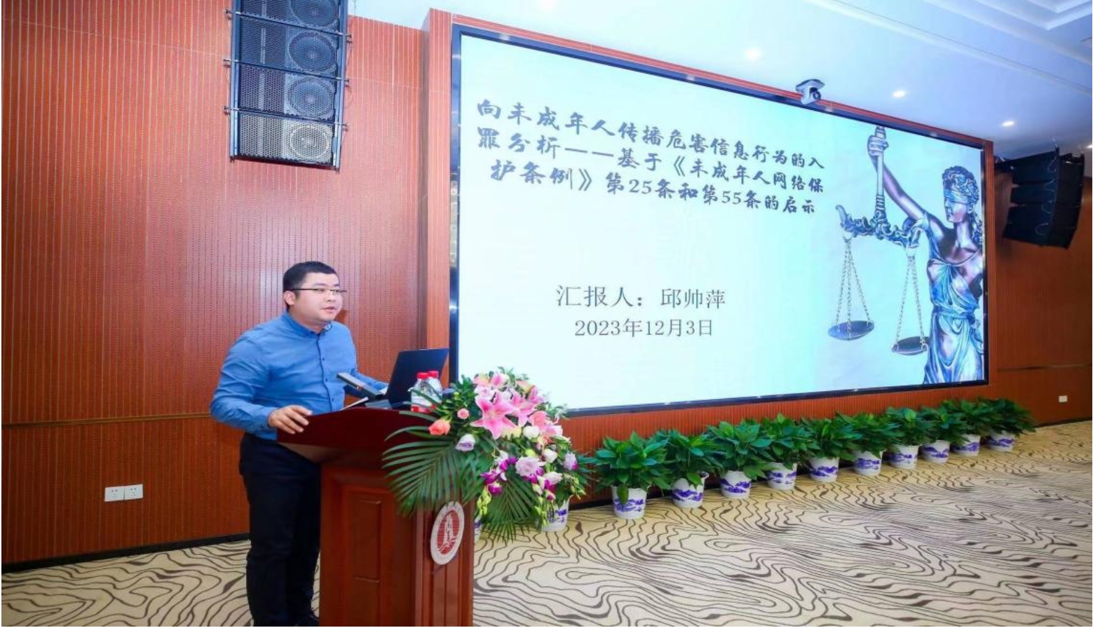 会上,邱帅萍院长从立法梳理、立场阐明、路径建构等三个方面作了题为《论向未成年人传播危害信息的刑事可罚性——基于<未成年人网络保护条例>第25条和第55条的启示》的学术报告。蒋兰香教授从企业内部合规控制的视角作了题为《企业污染犯罪风险的合规控制路径》的学术报告。邱帅萍院长和蒋兰香教授的发言既有理论高度,又有实践广度,受到了与会领导、理论及实务专家的高度认可。(文/易柏良;一审:宋智敏;二审:邱帅萍)