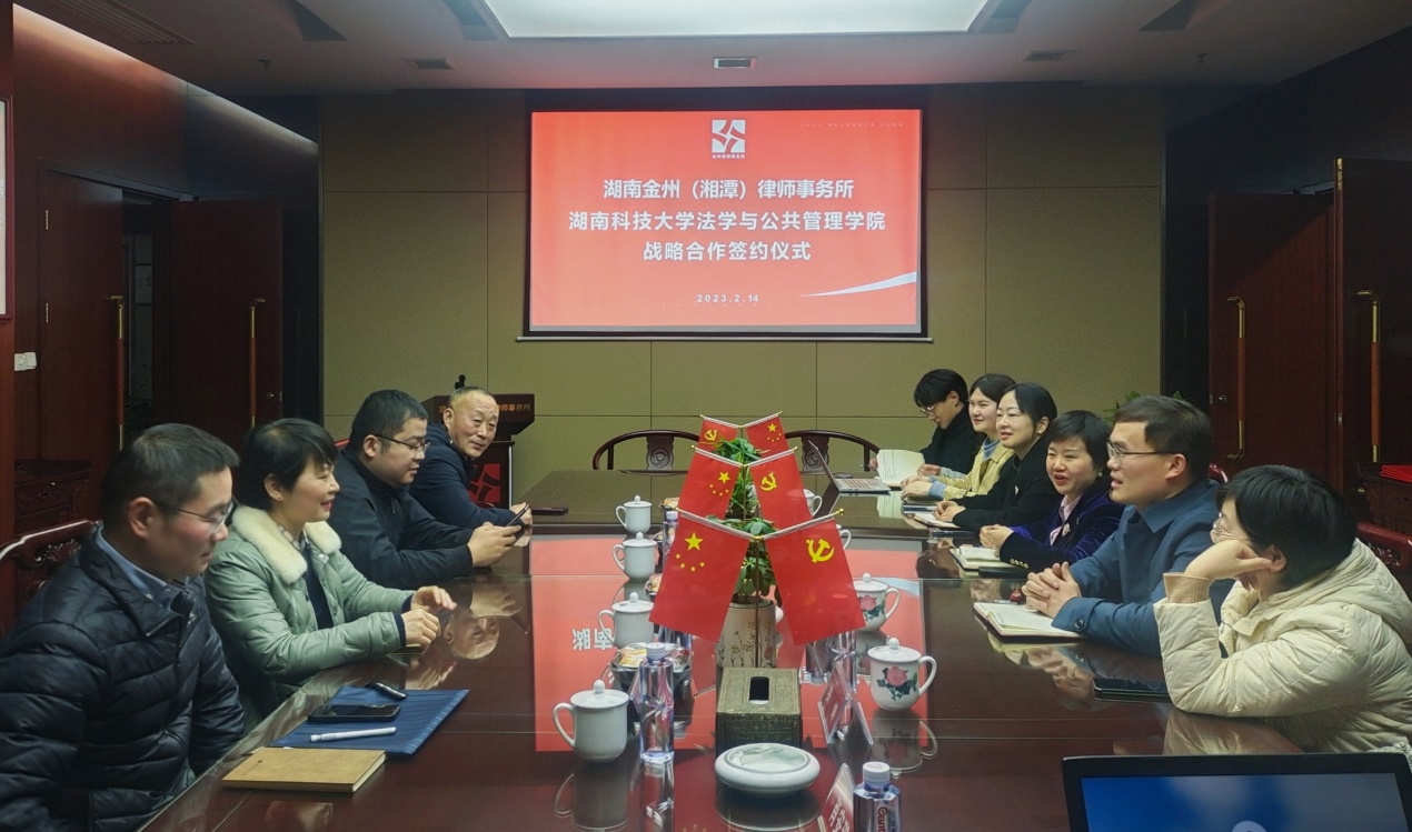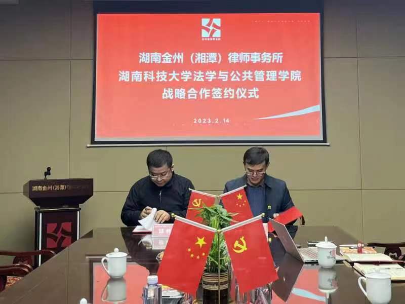 2023年2月14日,湖南金州(湘潭)律师事务所与湖南科技大学yl6809永利战略合作协议签订暨湖南科技大学法学教育实践基地授牌仪式在湖南金州(湘潭)律师事务所隆重举行。参加本次签约仪式的有湖南科技大学yl6809永利的邱帅萍院长、马驰升主任、胡正昌教授、左洪剑主任以及金州湘潭所党支部书记暨律所主任王继文、管委会主任潘柳、王莹律师、扶婷律师和部分湖南科技大学法管学院在所校友。