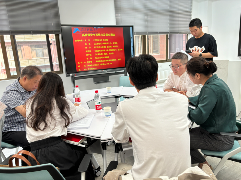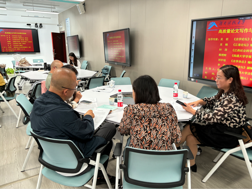 10月12日上午,高质量论文写作与发表交流会在我校立言楼A317顺利进行。本次交流会邀请了《法学论坛》原主编吴岩、《江淮论坛》编辑部主任,研究员吴楠、《江西社会科学》副主编,研究员叶萍、《南通大学学报(社会科学版)》副主编顾理辉、《法学杂志》编审,研究员刘宇琼和《江汉论坛》副编审李涛前来指导。会议由我院副院长宋智敏教授主持,胡之芳教授、黄素梅教授、刘鄂副教授,马驰升主任等我院领导老师参加了本次交流会。