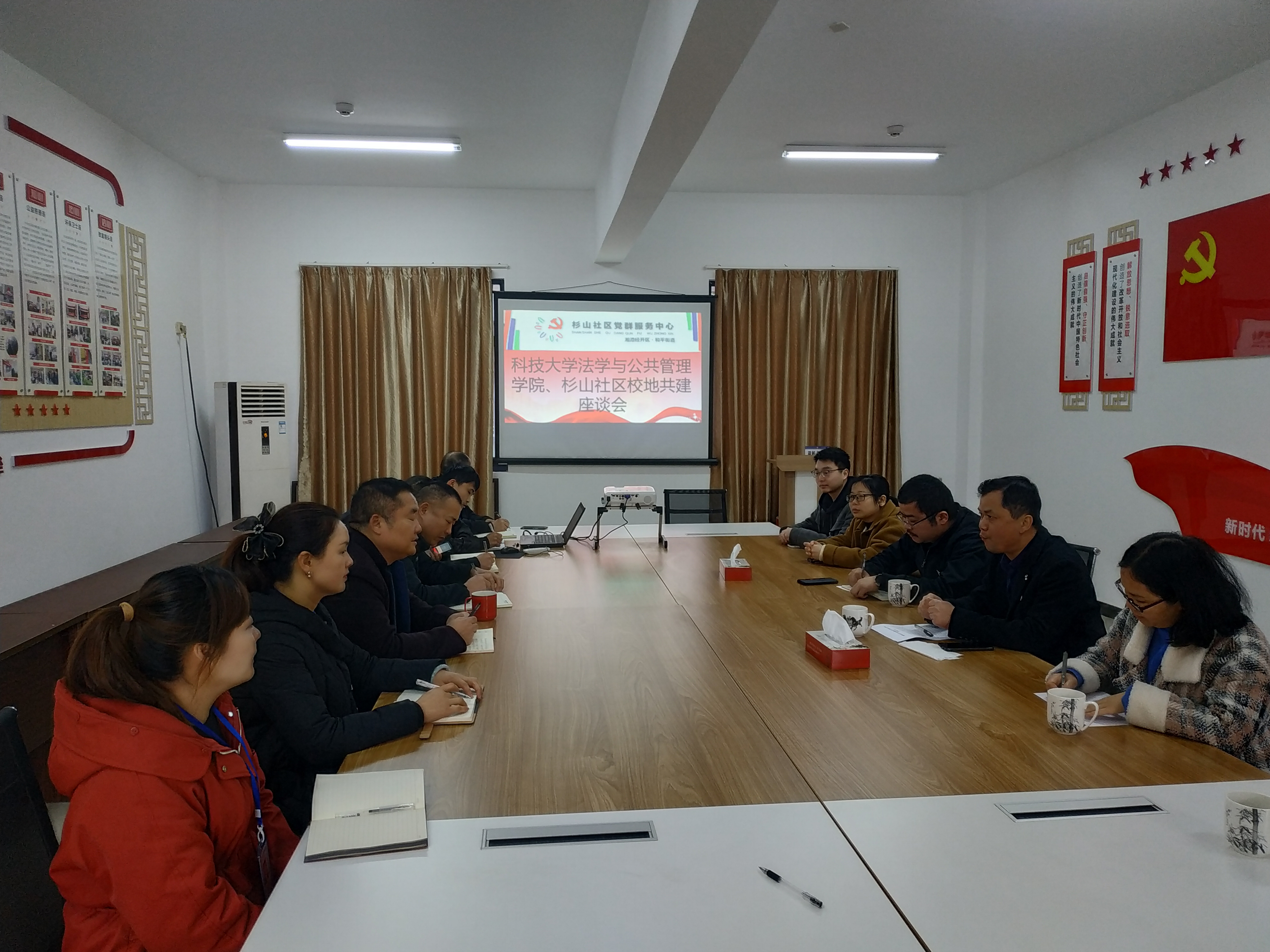 会上,双方就全面落实校地合作共建,实现资源优势互补,加强人才培养,提高学生实践操作能力,弥补社区党建存在的短板等内容进行了交流讨论。杉山社区党委书记罗自光对法管学院邱书记一行表示热烈的欢迎,并简要介绍了社区的基本情况,以及“红心五连”特色的党建工作。yl6809永利党委书记邱帅萍简要介绍了学院的历史沿革、专业特色、人才培养,以及在法律服务、法律咨询、地方立法上取得的一些成效。杉山社区党委副书记彭海均就社区目前党建工作存在的不足,如宣传力度不够进行了说明,也表示希望和法管学院有很好的合作交流,能够在党建及社区管理工作方面获得学校的支持。