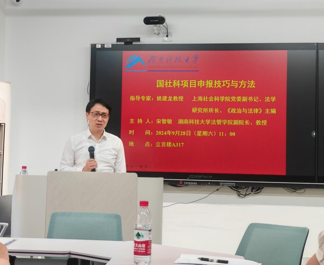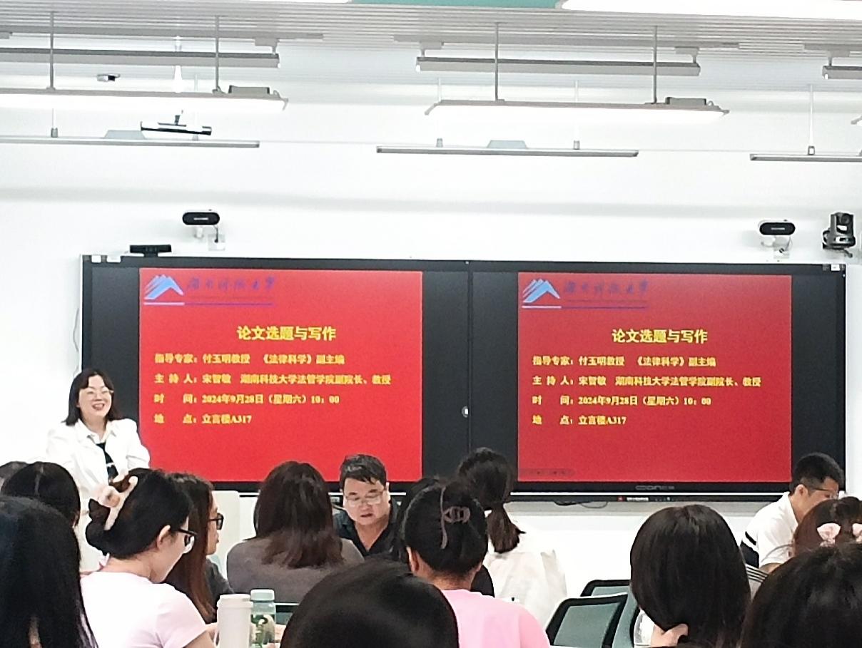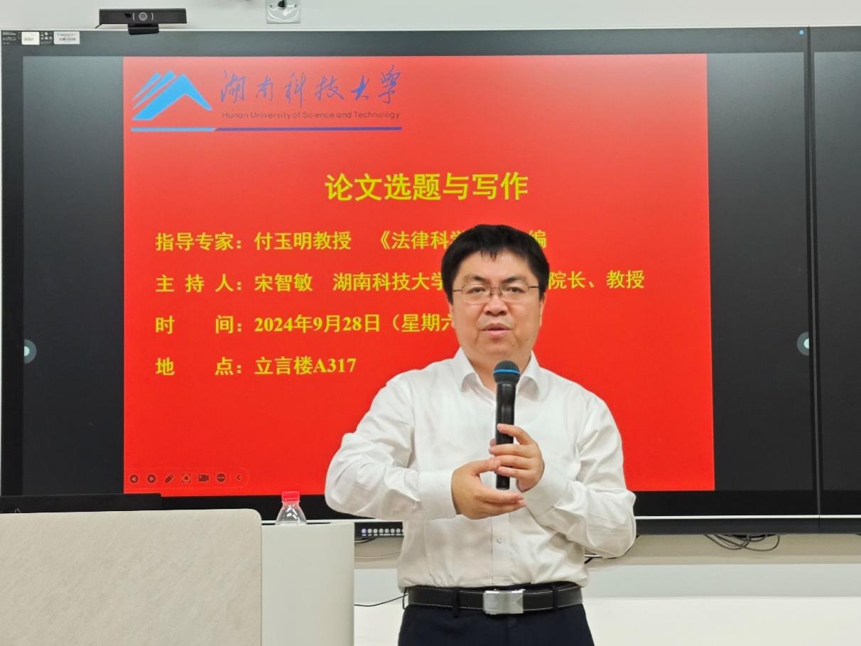 2024年9月28日上午,一场聚焦法学论文写作与项目申报的指导会在立言楼A317成功举办。本次指导会邀请了上海社会科学院党委副书记、法学研究所所长、《政治与法律》主编姚建龙教授,以及《法律科学》副主编付玉明教授作为指导专家,湖南科技大学法管学院副院长、宋智敏教授担任主持人。yl6809永利全体专任教师、2024级全体法律硕士研究生参与了此次指导会。