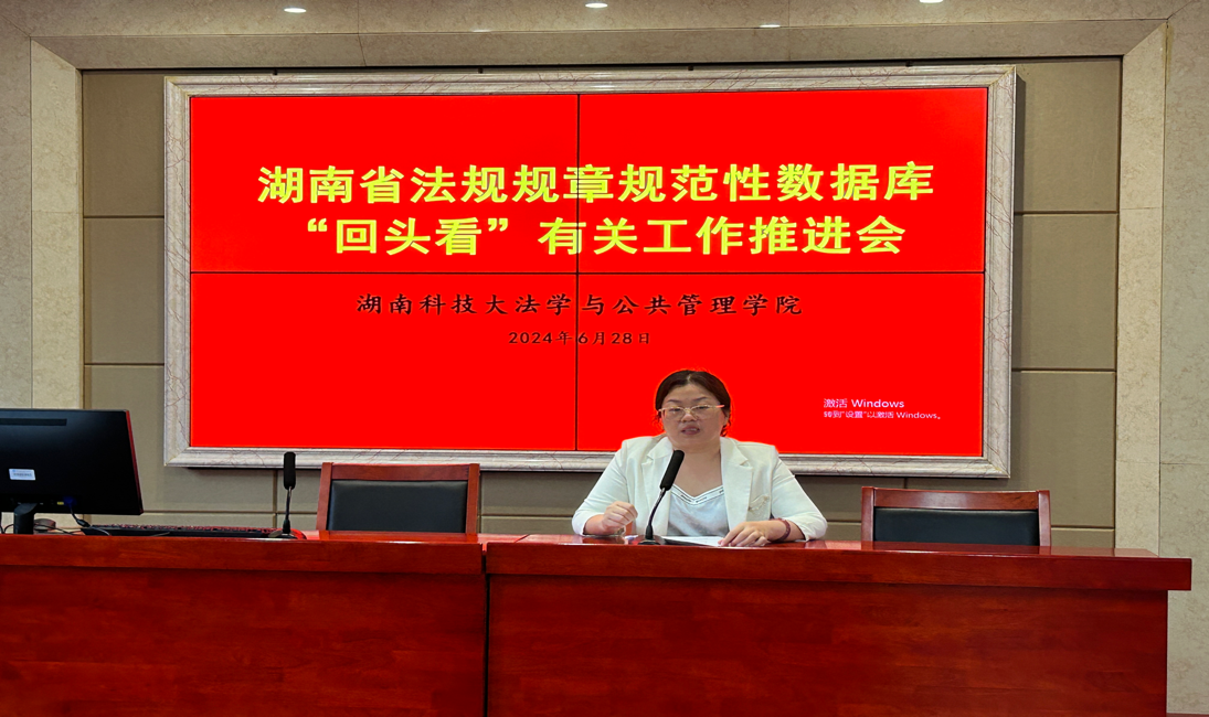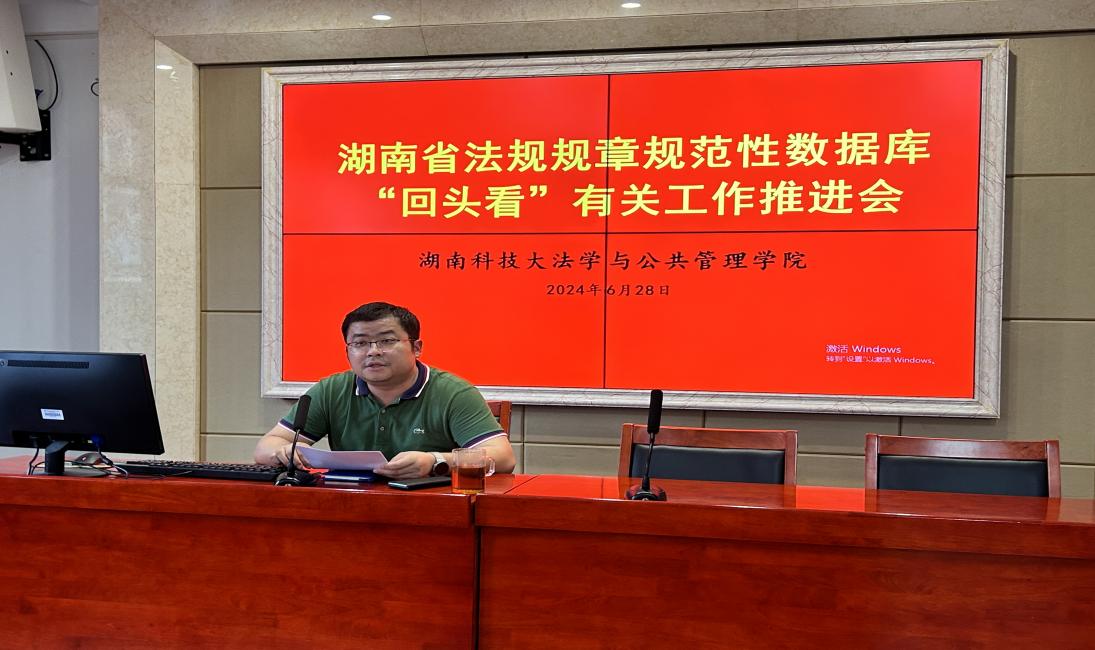 2024年6月28日下午,yl6809永利在立言楼A425召开湖南省法规规章规范性数据库“回头看”有关工作推进会。会议由院长邱帅萍教授主持,副院长、省人大常委会立法研究基地执行主任宋智敏教授、校法务中心主任马驰升副教授以及所有法科教师参加了会议。