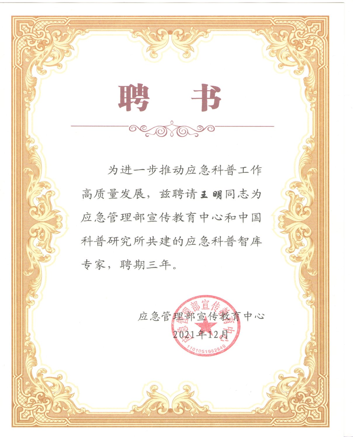 我院王明副院长获聘应急管理部宣传教育中心应急科普智库专家