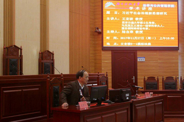 西安交通大学王宏波教授应邀来我院做学术报告 11月27日上午10点,yl6809永利在立言楼3-2模拟法庭举行学术报告会,邀请西安交通大学博士生导师王宏波教授作了题为“习近平社会治理新思想研究”的报告。报告会由副院长陆自荣教授主持,宋智敏、袁玉明、徐金燕、王明、王慧慧、朱宇、罗珊、王球云等学院老师和100多名学生参加学习。 习近平治国理政思想是中国特色社会主义理论逻辑和实践逻辑的有机统一,是当代中国最鲜活的马克思主义。王教授围绕十九大报告专题的内容和精神,首先回顾了改革开放前后中国政府职能转变和社会管理变化的过程,系统阐述了社会治理形成和发展的历史必然性;接着以习近平关于中国特色社会主义社会治理思想为核心,分析了社会治理和社会管理的区别及其主要内容、特点、原则和方法;最后提出了在实现中华民族伟大复兴的中国梦征程中创新社会治理的七大任务,其中重点强调发展教育事业、完善住房保障、振兴乡村战略等改善民生领域的热点问题。 陆院长对报告进行了总结点评,指出王教授的讲座立足学科前沿,紧扣社会热点,内容全面具体,深入浅出,从社会治理视角探讨民生问题,拓展了师生研究和学习的视野;并结合法学和公管不同专业学生特点为其指明了努力学习的方向! (责任编辑:admin) |