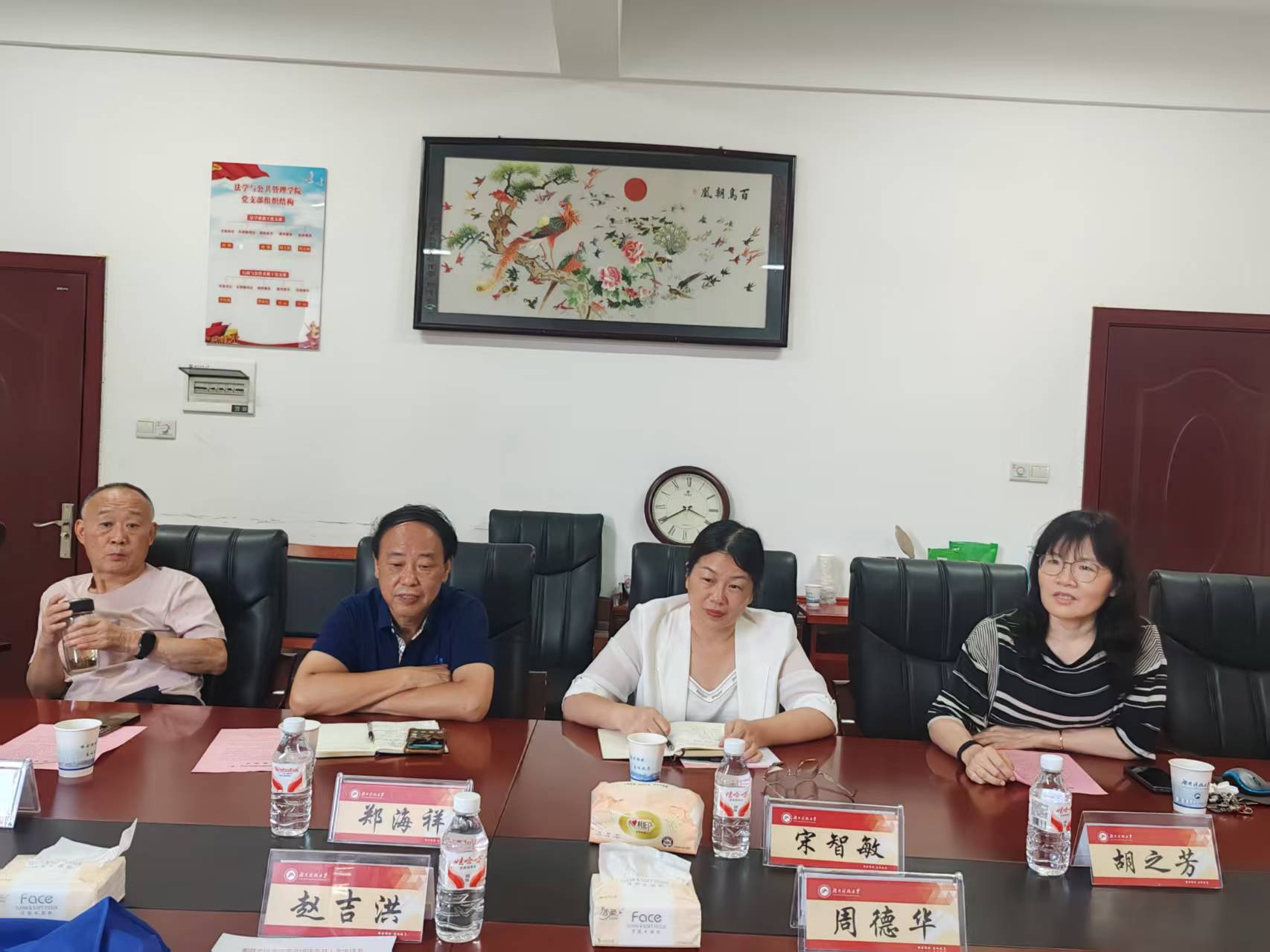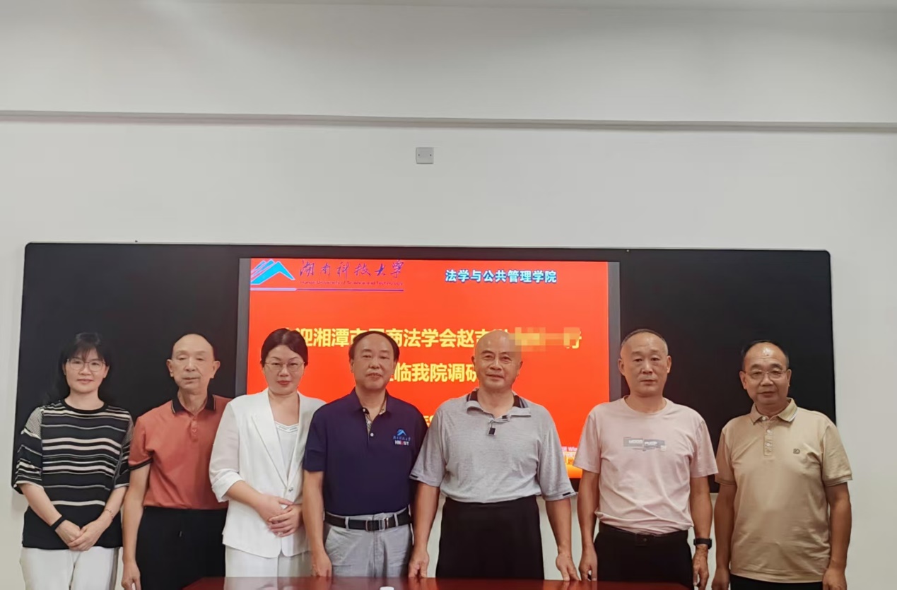 9月4日下午,湘潭市司法局原党组书记赵吉洪、湘潭市中级人民法院行政庭原庭长刘宏、《法治湘潭》编委会常务副主任周德华三位专家来法管学院调研交流,院党委书记郑海祥、副院长宋智敏、胡正昌教授、胡之芳教授出席了调研活动。