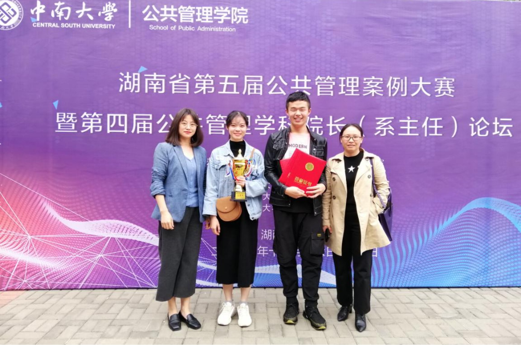为推动公共管理教学改革和学科发展,提高公共管理人才培养质量。 2019年11月16日至17日,湖南省第五届公共管理案例大赛暨第四届公共管理学科院长(系主任)论坛在中南大学新校区毓秀楼举行。本次论坛及大赛由湖南省人民政府学位委员会办公室主办,中南大学研究生院和中南大学公共管理学院共同承办,中南大学地方治理研究院和中南大学社会稳定风险研究评估中心协办。我院王慧慧、曾东霞老师应邀参加,论坛主要就新时代公共管理学科建设、人才培养、机遇挑战和发展前景等重要问题进行了讨论。案例大赛有来自省内高校的28支本科生队伍、24支研究生队伍报名参赛。我院也积极组织学生参赛,共有3支本科生队伍提交了文本案例,其中曾东霞老师指导的由刘怀瑾、温颖、徐抒姝、王晓珍四位同学组成的“by talent队”获得三等奖,其余两队获优秀奖。