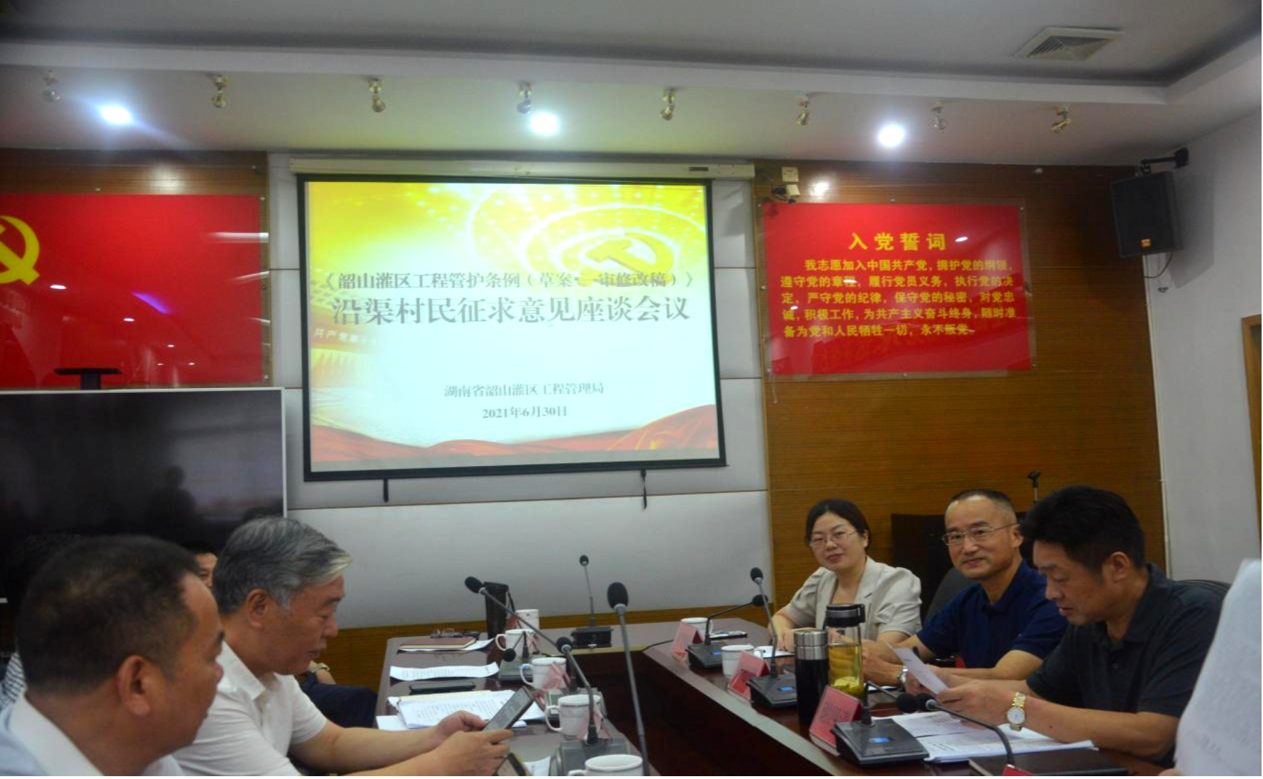 2021年6月30日上午,yl6809永利院长徐德刚教授和校立法研究所所长宋智敏教授应邀参加《韶山灌区工程管护条例(草案·一审修改稿)》沿渠村民征求意见座谈会,多名研究生随行参加。本次活动由市人大常委会副主任阳建民带队,调研组成员来自市人大常委会办公室、法制委、内司委,湘潭市司法局、湘晋律师事务所,潭州律师事务所、驻潭高校等单位。会议由湖南省韶山灌区管理局组织,湘潭县、湘乡市、韶山市相关部门负责人,以及湘潭县、湘乡市、雨湖区、韶山市、宁乡市五个县市区的多位村民代表参加了会议。