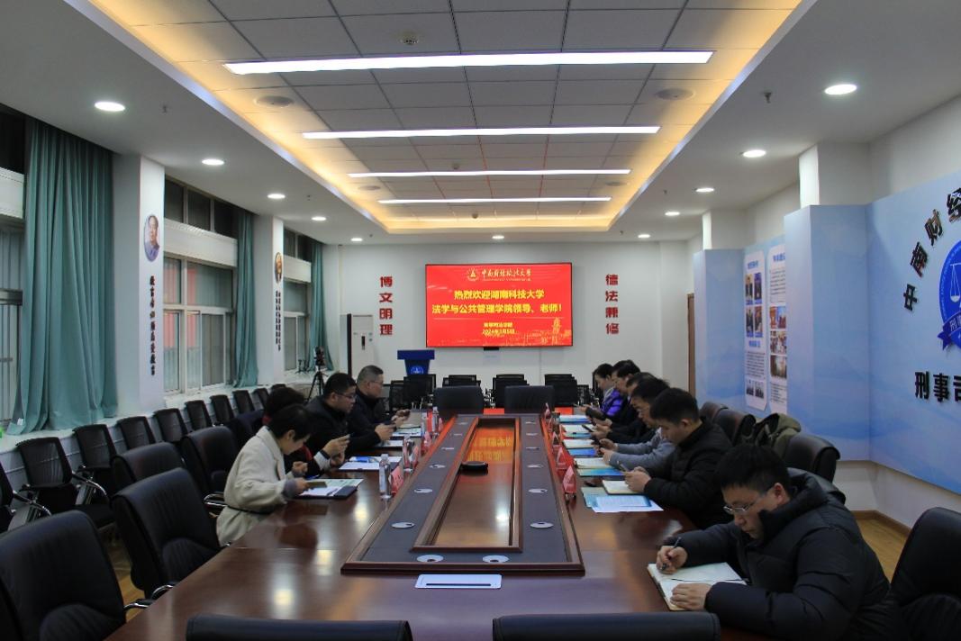 邱帅萍院长感谢法学院的热心接待并详细介绍了湖南科技大学历史发展及法学学科建设等情况,表示此次调研考察旨在学习交流师资引进、法学实验室建设及学科发展经验,为两校进一步合作交流打下基础。