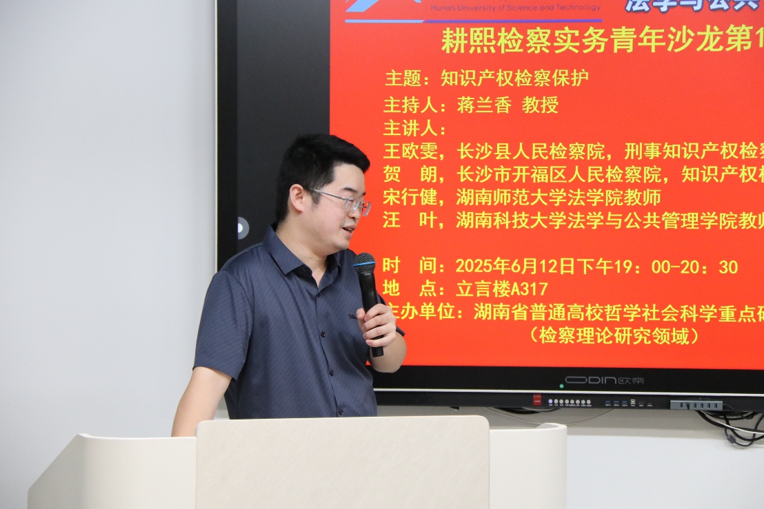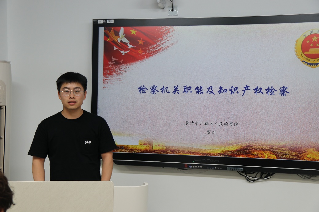 长沙市开福区检察院第四检察部检察官助理、知识产权专干贺朗首先开讲。他主要聚焦检察机关职能及知识产权检察展开讲解。贺朗指出,知识产权检察综合履职意义重大,知识产权案件集中管辖制度给检察工作带来了新挑战与机遇。此外,他还通过分享实务中的恶意诉讼等相关案例,引发大家对理论付诸于实践现实情况与困境的思考。