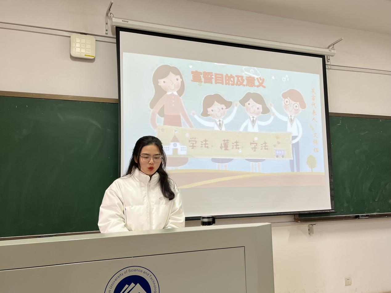 “知是行之始,行是知之成”,为了增强同学们的宪法意识,筑牢宪法信仰,自觉遵守、坚定捍卫宪法权威,大力弘扬宪法精神,实现宪法理论与实践的有机结合,3月24日上午,21级法学三、四班全体同学在立功楼B508举办了一次模拟宪法宣誓活动。活动由法学四班雷洋同学主持,《宪法学》主讲教师徐德刚教授监誓。