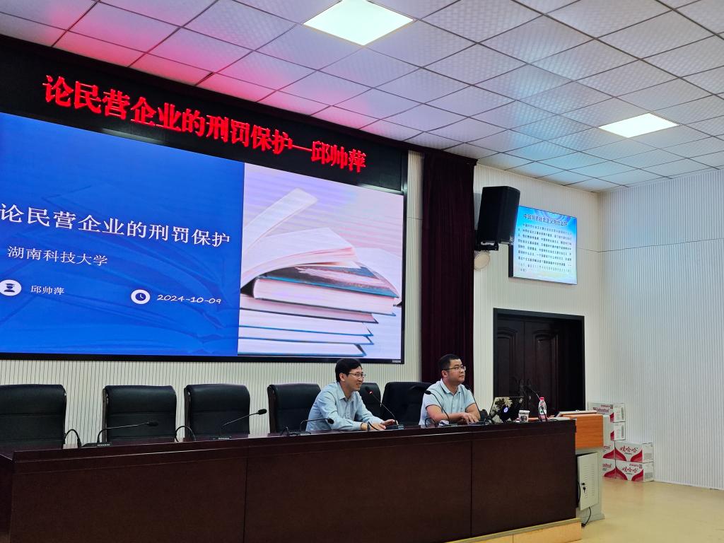 2024年10月9日下午16时,院长邱帅萍教授受邀前往吉首大学,于思政园1207报告厅成功举办了一场题为《民营企业的刑罚保护》的专题学术讲座。此次讲座由吉首大学yl6809永利副院长郑牧民教授主持,吸引了众多师生前来聆听。