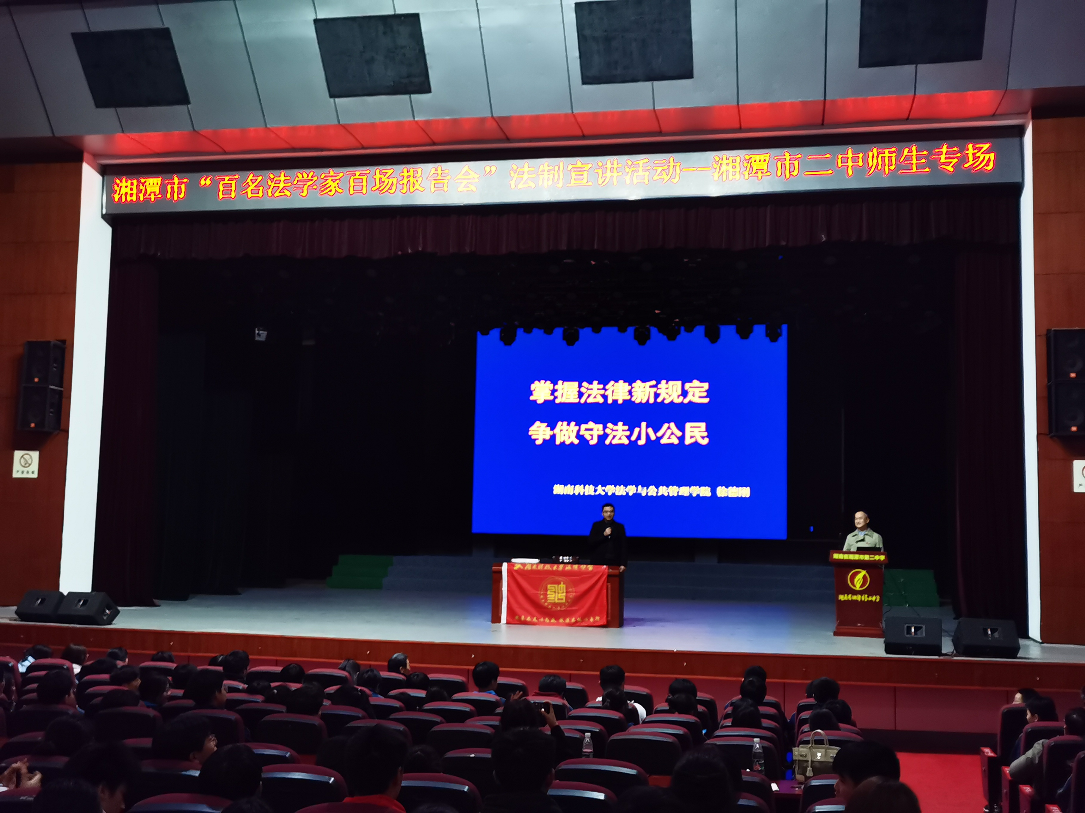 为深入学习、宣传和贯彻习近平法治思想,增强中学师生法治意识,2023年03月23日,湘潭市“百名法学家百场报告会”法治宣讲活动——-湘潭市二中师生专场于下午4:30在湘潭市二中艺术楼三楼演艺大厅举行。我院徐德刚教授带领湖南科技大学法律协会三位同学冒雨深入学校开展了普法宣讲,湘潭市二中初一、高一部分学生及相关教师共700余人参加。