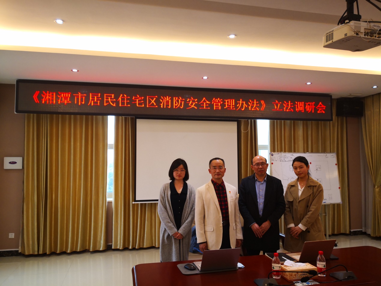 为了规范居民住宅区消防安全管理,预防和减少火灾危害,保护人身、财产安全,湘潭市人民政府决定制定《湘潭市居民住宅区消防安全管理办法》(草案)(以下简称《办法》),该《办法》由我院立法团队负责起草并提供智力支持。2021年4月22日下午,我院徐德刚院长、李云霖教授带领研究生曾怀莹、郭哲前往湘潭市消防救援支队参加了本次草案调研会,湘潭市人大、市政协、市司法局、市公安局、市应急管理局等相关单位的领导以及来自湘潭市社区、律所、物业服务企业等有关群体的代表出席了本次会议。
