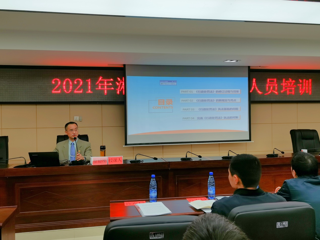 今年7月15日,新修订的《行政处罚法》正式实施。为做好新修订《行政处罚法》的实施工作,各地普遍开展了新法的学习宣传活动。10月22日,我院徐德刚教授应湘乡市司法局邀请,为湘乡市司法局及政府相关执法机关的百余位行政执法人员做了一场题为《<行政处罚法>的修订与实施》的法治宣讲课,湘乡市司法局刘明局长主持讲座,研究生胡琪鹃、姚朵、李立言随导师参加了宣讲活动。