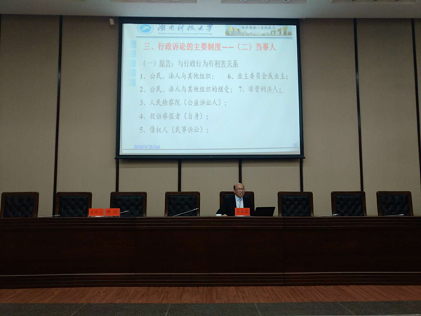2018年4月28日上午,我院李云霖教授在湘潭市人大常委会进行了题为“法治政府建设中的行政诉讼制度”讲座。讲座由湘潭市人大常委会韩晓秘书长主持,湘潭市人大常委会杨建业副主任、潘爱民副主任、阳建民副主任、湘潭市人大各位专门委员会主任与副主任,以及市人大常委会机关的其他工作人员到场参加。 李云霖教授从行政诉讼制度与十八大以来法治政府的决断、行政诉讼制度的主要法律和司法解释、法治政府建设中的行政诉讼主要制度三方面进行了深入阐释。围绕法治政府建设,萃取了十八大以来历次重要大会中关于法治政府的关键内容,及其与行政诉讼制度的联系进行分析。关于行政诉讼制度的法律渊源,介绍了行政诉讼制度的主要法律和司法解释的最新进展,及其对法治政府建设的实效影响。受案范围、当事人、跨区域管辖、立案登记、起诉期限等行政诉讼的具体制度,则在一个个生动的案例中得到通俗的表述和深刻的解释。 湘潭市人大常委会高素质工作人员及其崇法和学法精神,为讲座营造了生动活泼的氛围。最后,韩晓秘书长进行了精彩点评,整场讲座在热烈的掌声中圆满完成。 (责任编辑:admin) |