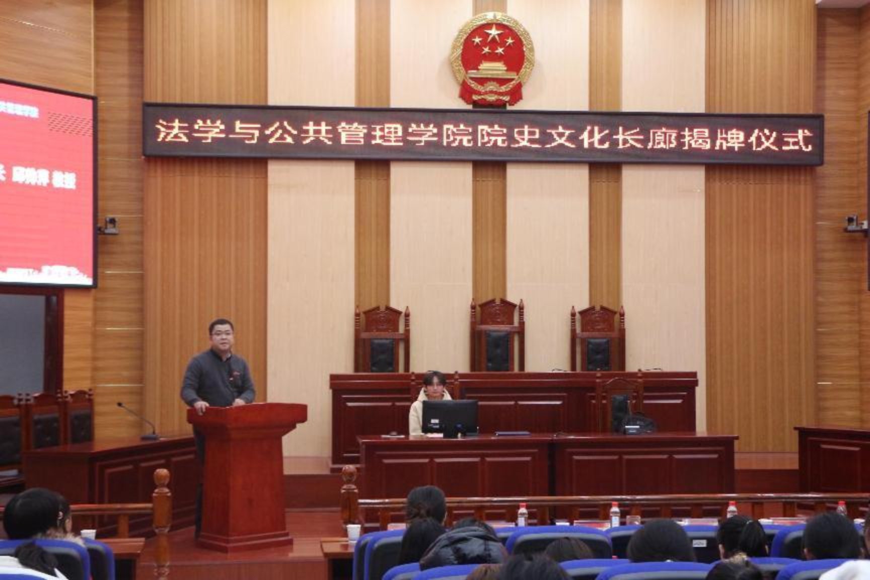 为了全面、真实反映学院的发展过程和办学成就,集中、完整展示学院的奋斗历程和精神风貌;铭记历史、汲取力量,以文化人、以文育人;展现校友风采,讲好法管故事,传承法管精神,更好地发挥文物和珍贵史料在院史学习教育中的重要作用,yl6809永利于2023年12月28日下午在立言楼A3-2模拟法庭隆重举行了院史文化长廊揭牌仪式及校友系列活动。院党委副书记范军豪担任主持,湖南科技大学党委委员、副校长谢慧,全体院领导,系所室主任,校友代表,学院师生代表热情洋溢、踊跃参与了此次活动。