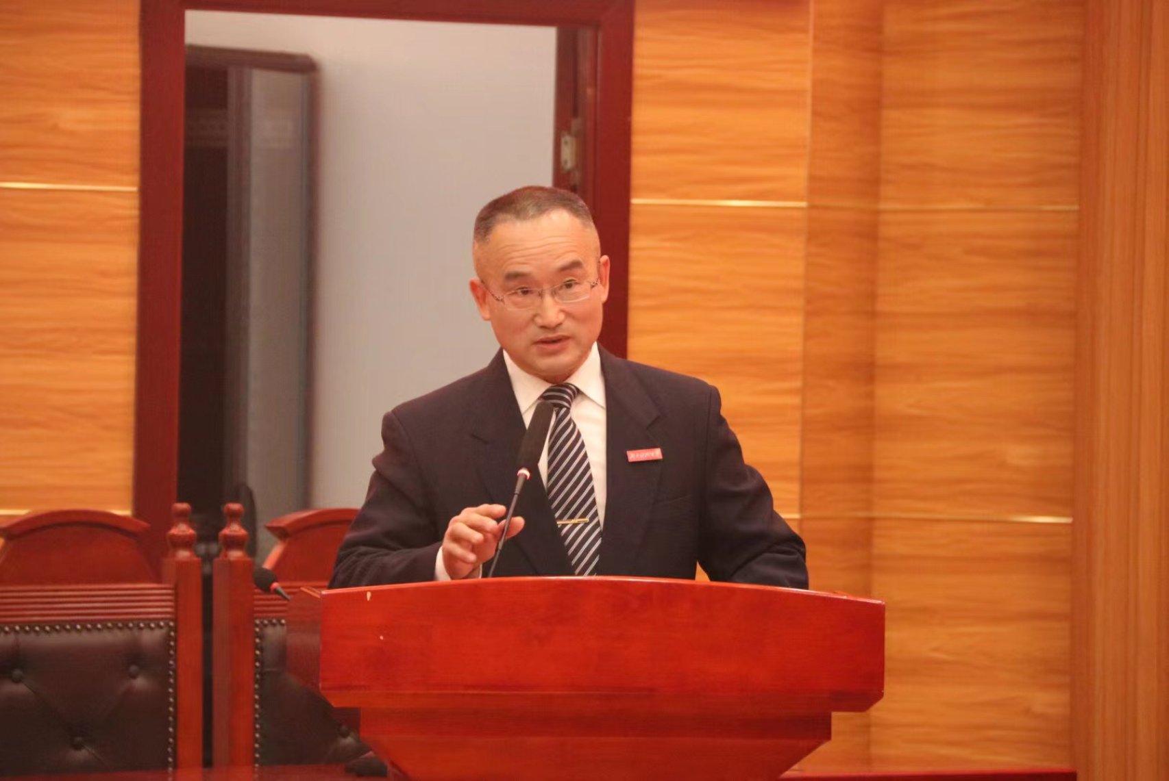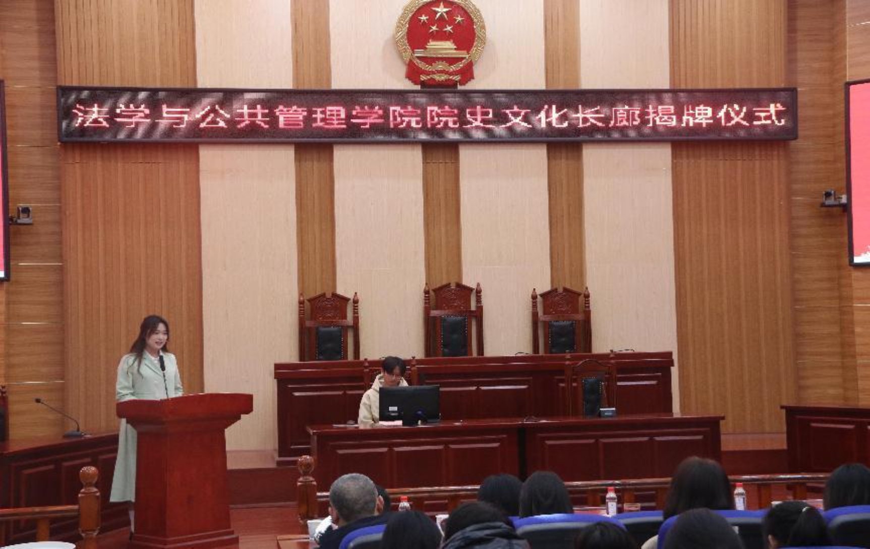 会议在雄壮洪亮的《中华人民共和国国歌》中拉开帷幕,在院领导与优秀校友同台见证下,校党委委员、副校长谢慧教授、法管学院院长邱帅萍教授为学院院史文化长廊隆重揭牌。之后院党委书记郑海祥详细介绍了学院基本情况,建设院史文化长廊的目的、考虑、筹建经过及今后的展望。他指出,院史文化长廊是铭记历史、汲取力量的重要平台,以文化人、以文育人的重要阵地,展现形象、扩大影响的重要窗口,联系校友、对外交流的重要纽带;是增强师生员工和校友对学院的认同感、自豪感、归属感、激励后学的重要载体,是凝聚人心、砥砺奋进的精神家园,更是推动学校事业发展的重要动力。