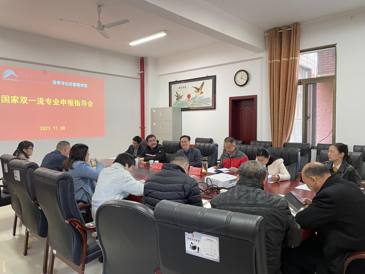 2021年11月8日下午,我院国家双一流专业和国社科基金课题申报专家指导会在立言楼A427召开,湘潭大学党委副书记廖永安教授应邀莅临指导。会议由我院党委书记邱帅萍主持,徐德刚、李云霖、胡正昌、宋智敏、马驰升、王明、胡之芳、徐金燕、吴四江、易卫中、向明、李倩、刘鄂、章小兵、雷连莉、张美玲、雷勇、李凤翔等老师参与了交流讨论。