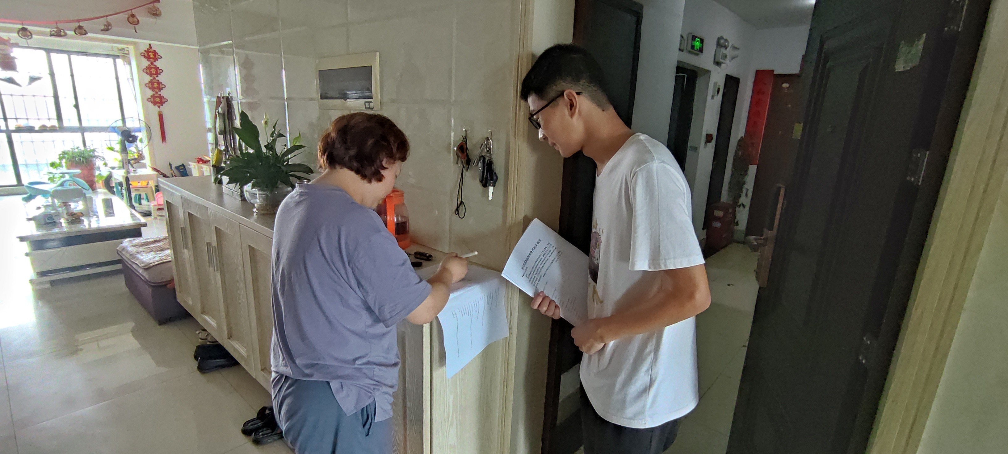 在摆点宣传工作干的热火朝天之际,我院社会调查小队的入户走访调查工作也正在稳步开展。为更加深入地了解社区居民生活状况,收集社区物业管理问题以及居民的反馈和意见,我院社会调查小队深入各小区各单元开展入户走访调查工作。在调查过程中,我院学子有计划的走访小区各单元,礼貌地敲门、问候,在征得主人同意后,进入室内进行问卷调查。面对面的交谈显得更为亲切,而在居民家中也让居民更加舒服,能够较为自在地填写问卷。虽然,在这个过程中,调查小队多次被人拒绝,被人误会,不被理解,但我院学子毫不气馁,秉着“这家不行,换下家”的信念,砥砺奋进,不懈努力,最终收获了满意的答卷。