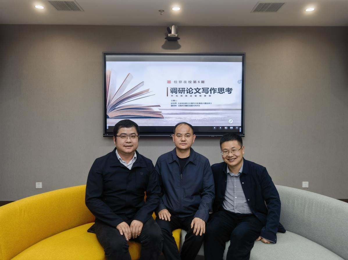4月11日下午,为响应中共中央办公厅印发的《关于在全党大兴调查研究的工作方案》的指示,院长邱帅萍教授应怀化铁路运输检察院邀请参加该单位举办的“调研论文写作与思考”学术交流活动并担任主讲嘉宾,担任主讲嘉宾的还有湖南省人民检察院法律政策研究室副主任谭泽林。
